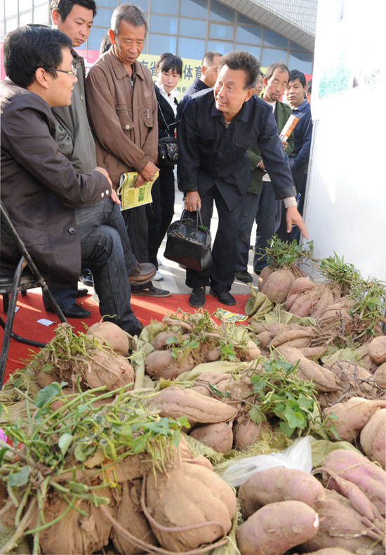 10月21日,第七屆全國特種養(yǎng)殖種植技術(shù)成果博覽會在安陽舉行,來自河南省安陽市等各地的數(shù)百項農(nóng)業(yè)新產(chǎn)品、新成果在展覽會上進行了展示和交流。 圖為幾名農(nóng)民在博覽會上了解巨型紅薯的種植技術(shù)。