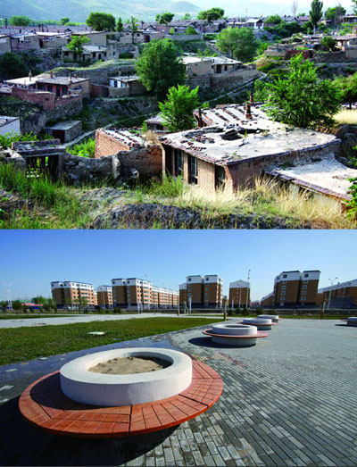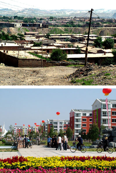 這是神華寧煤集團(tuán)金能公司沉陷區(qū)老住宅原貌(上圖,資料照片)和金能公司礦工新居(下圖,2009年10月攝)對比。 |