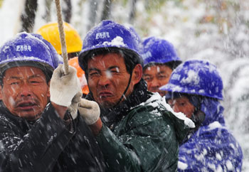 圖為11月16日,安徽省肥西縣供電部門的工作人員冒著大雪在該縣煙墩鄉(xiāng)進(jìn)行主線路的緊急搶修。