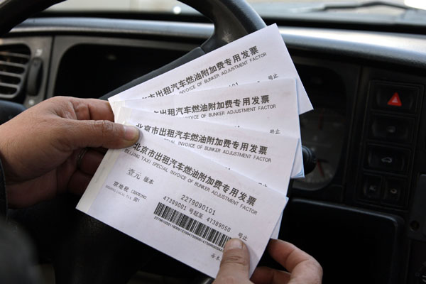 11月24日,一名出租車司機展示出租車燃油附加費專用發(fā)票。 11月25日零時起,北京出租車正式開收燃油附加費。乘客乘坐出租汽車超過3公里(基價公里)的,每次在計價器顯示金額外加付1元燃油附加費。