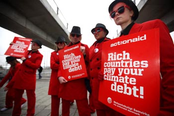 12月9日,在丹麥?zhǔn)锥几绫竟,環(huán)保人士在聯(lián)合國(guó)氣候變化大會(huì)會(huì)場(chǎng)外舉行活動(dòng),要求發(fā)達(dá)國(guó)家履行減排承諾,并為其歷史上過(guò)度排放、破壞環(huán)境的做法提供補(bǔ)償。新華社記者