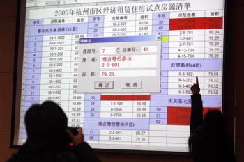 24日,杭州市首批經(jīng)濟租賃房進入最后的選房程序,通過公開搖號,首批52戶符合條件的家庭參加了現(xiàn)場公開選房。這批經(jīng)濟租賃房的推出是杭州市為解決低收入家庭住房問題而出臺的新政之一,主要為解決既不符合廉租房申請條件,又買不起經(jīng)濟適用房的低收入住房困難家庭;或者是即不符合經(jīng)濟適用房申請條件,又買不起普通商品房的“夾心層”的住房困難。新華社記者 徐昱 攝