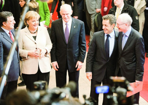 2月11日,(從左至右)歐盟委員會(huì)主席巴羅佐、德國(guó)總理默克爾、希臘總理喬治·帕潘德里歐、法國(guó)總統(tǒng)薩科齊和歐洲理事會(huì)常任主席范龍佩在比利時(shí)布魯塞爾的歐盟理事會(huì)大樓內(nèi)聊天。歐盟領(lǐng)導(dǎo)人11日在布魯塞爾舉行非正式會(huì)晤,重點(diǎn)討論希臘政府債務(wù)危機(jī)、未來(lái)10年經(jīng)濟(jì)發(fā)展戰(zhàn)略、全球應(yīng)對(duì)氣候變化談判和海地災(zāi)后重建。(相關(guān)報(bào)道見(jiàn)今日四版)新華社發(fā) |