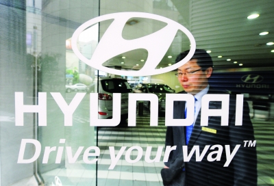 2月24日,在韓國首都首爾,韓國現(xiàn)代汽車公司員工從印有公司標(biāo)志的玻璃門前走過。 韓國現(xiàn)代汽車公司當(dāng)日宣布,由于車門鎖的問題,將于近期在美國及韓國本土召回該公司生產(chǎn)的新款索納塔轎車。