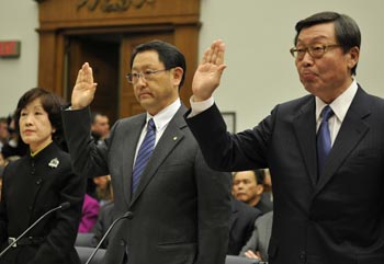 2月24日,在美國首都華盛頓國會眾議院,豐田公司總裁豐田章男(中)出席聽證會。新華社記者 張軍