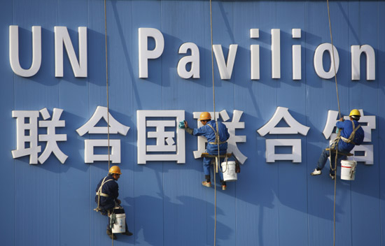 3月17日,幾名工人正在清洗聯(lián)合國聯(lián)合館的外墻。當日,距上海世博會開幕僅剩下45天,世博園區(qū)內(nèi)一萬多名建設(shè)者正加班加點、全力沖刺,確保園區(qū)內(nèi)各項工程如期完工。