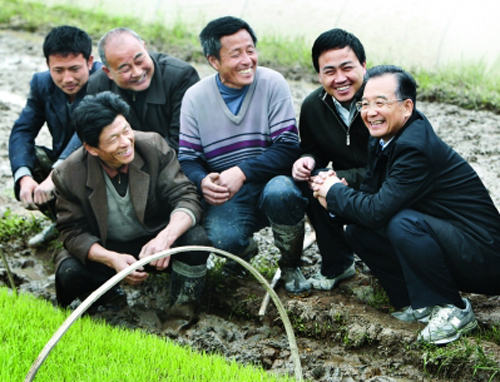 4月9日至11日,中共中央政治局常委、國(guó)務(wù)院總理溫家寶來(lái)到安徽蚌埠、池州兩地,深入田間地頭察看苗情,走村入戶看望群眾,實(shí)地考察農(nóng)產(chǎn)品加工龍頭企業(yè)和治淮工程現(xiàn)場(chǎng),召開(kāi)座談會(huì)聽(tīng)取基層干部群眾的建議。 這是4月10日,溫家寶在池州市貴池區(qū)梅龍鎮(zhèn)和當(dāng)?shù)剞r(nóng)民一起察看早稻育秧情況。