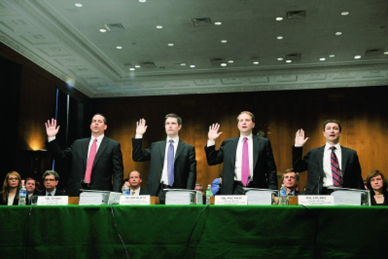 4月27日,在美國首都華盛頓國會山,包括高盛副總裁法布里斯·圖爾(前右一)在內(nèi)的高盛集團(tuán)高管出席美國參議院國土安全和政府事務(wù)永久委員會就高盛事件舉行的聽證會。聽證會上,被美國證券交易委員會指控犯有欺詐罪的圖爾否認(rèn)他向客戶隱瞞實質(zhì)性信息。委員會主席卡·萊文則表示,“高盛的行為表明它并沒有尊重客戶的價值,而是將客戶作為賺錢的對象。”