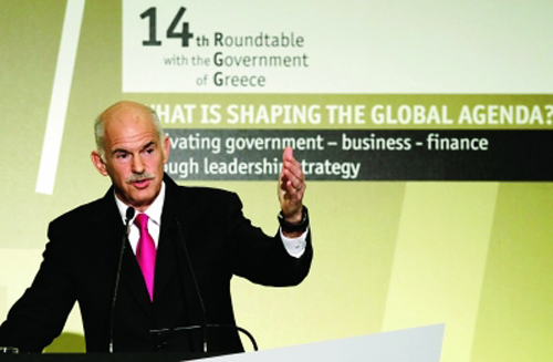 4月28日,在希臘首都雅典,希臘總理帕潘德里歐在《經(jīng)濟學人》雜志舉辦的一次研討會上發(fā)表演講。帕潘德里歐當日呼吁進行全球金融監(jiān)督管理,以應對已從希臘蔓延到歐元區(qū)其他成員國的嚴重經(jīng)濟危機。新華社發(fā)