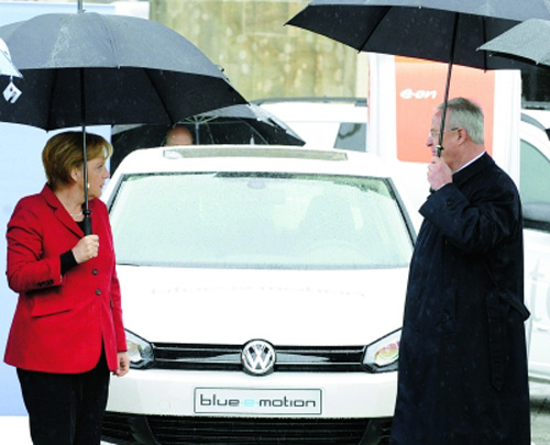 5月3日,在德國(guó)首都柏林的勃蘭登堡門(mén),德國(guó)總理默克爾(左)與德國(guó)大眾汽車公司首席執(zhí)行官馬丁·溫特科恩觀看大眾公司的電動(dòng)或混合動(dòng)力汽車。當(dāng)天,默克爾與500多名政界、產(chǎn)業(yè)界和科研機(jī)構(gòu)人士在柏林共同啟動(dòng)了名為德國(guó)“國(guó)家電動(dòng)汽車計(jì)劃”的項(xiàng)目,旨在進(jìn)一步促進(jìn)電動(dòng)汽車的研究和市場(chǎng)化。 |