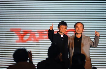 5月10日,阿里巴巴集團(tuán)董事局主席兼CEO馬云(左)與日本軟銀集團(tuán)總裁兼董事長孫正義在戰(zhàn)略合作新聞發(fā)布會上。 當(dāng)日,中國網(wǎng)絡(luò)零售網(wǎng)站淘寶網(wǎng)與日本軟銀集團(tuán)控股雅虎公司在浙江杭州舉行戰(zhàn)略合作新聞發(fā)布會。根據(jù)規(guī)劃,雙方在戰(zhàn)略合作基礎(chǔ)上,將通過數(shù)據(jù)對接,計(jì)劃于6月份推出中國和日本的首個跨國網(wǎng)絡(luò)購物平臺,此次戰(zhàn)略合作被視為是中國網(wǎng)絡(luò)零售網(wǎng)站淘寶網(wǎng)選擇日本作為進(jìn)軍海外的第一站。 |