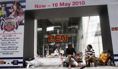 5月16日,泰國反政府示威者在首都曼谷街頭的一個廣告牌下休息。據(jù)外電報道,泰國軍方16日說,泰國當局放棄在曼谷部分地區(qū)實施宵禁的計劃。