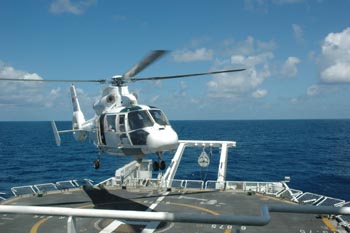 4月15日清晨,原本晴朗的天氣突然淅淅瀝瀝下起了小雨,氣溫驟降了10來度。碼頭上本來安排了隆重的起航儀式,由于雨下得瀟瀟灑灑,風(fēng)刮得冷冷嗦嗦,儀式只好從簡。中國海監(jiān)的同志們告訴我,出航前趕上下雨,是一件很吉利的事,“風(fēng)調(diào)雨順”。 簡樸莊重的儀式過后,帶著祖國和人民的重托,我們?cè)陲L(fēng)雨中起航了。 我懷著興奮和激動(dòng)登上了中國海監(jiān)83船。 它是中國海監(jiān)的旗艦,在海洋行政執(zhí)法、海洋科考等方面功勛卓著,多次被共青團(tuán)中央、國家海洋局授予“全國青年文明號(hào)”稱號(hào)。船長98米,型寬152米,型深7.8米,排水量3980噸,最大航速18節(jié),續(xù)航力1萬海里,自持力60天,床位80個(gè),是我國目前設(shè)備最先進(jìn)、動(dòng)能最強(qiáng)大的公務(wù)船舶。 在船艙里安頓好之后,我滿懷好奇地到處“探險(xiǎn)”。這是我平生登上的最大的船,很有點(diǎn)“泰坦尼克”的味道,在里面鉆來鉆去,稍不注意就陷入“迷宮”。 駛出珠江口以后,正趕上八級(jí)大風(fēng)和3米高的中浪,船搖晃得厲害,我急忙回到艙內(nèi),由于站立不穩(wěn),只好踉踉蹌蹌地扶住床沿,把早就帶在身上的防止暈船藥狼吞虎咽地吃下去,心里忐忑不安,默默地祈禱:大海啊,保佑我吧,千萬別讓我暈船。 到了晚上,船顛簸得更加厲害了:杯盤在桌子上演奏著交響樂,而塑料桶和行李箱則在地上上演乾坤大擲移,我們躺在床上,像是翻烙餅,胸口堵得慌,煞是難受,根本無法入睡,迷迷糊糊就到了第二天早上。
