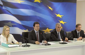 6月2日,希臘財(cái)政部長帕帕康斯坦季努(左二)在雅典出席新聞發(fā)布會。 希臘政府當(dāng)天宣布在應(yīng)對嚴(yán)重的債務(wù)危機(jī)的緊縮政策框架下,政府將對一系列國有公司進(jìn)行私有化改革。在未來3年,希臘政府希望通過合理使用公共資產(chǎn),募集30億歐元的資金。