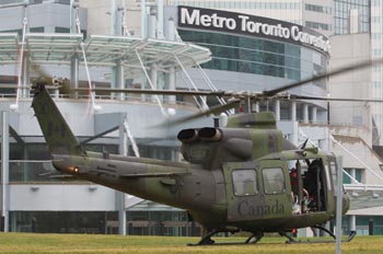 在加拿大城市多倫多,一架軍用直升機在G20峰會會場附近草坪上等待執(zhí)行巡邏任務。新華社發(fā)(鄒崢 攝)