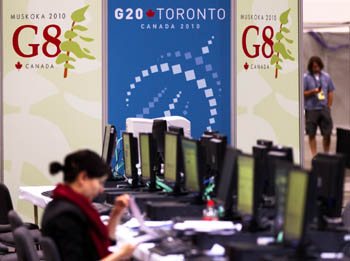 在位于加拿大多倫多的G8和G20加拿大峰會(huì)新聞中心,先期抵達(dá)的記者開始報(bào)道準(zhǔn)備工作。新華社發(fā)(鄒崢