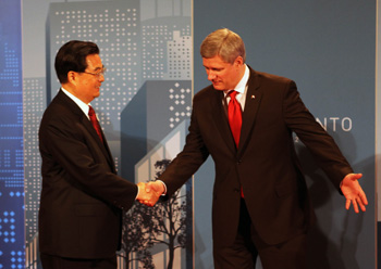 6月26日,中國(guó)國(guó)家主席胡錦濤在多倫多出席加拿大總理斯蒂芬·哈珀舉行的二十國(guó)集團(tuán)領(lǐng)導(dǎo)人工作晚宴。 這是斯蒂芬·哈珀在多倫多皇家約克飯店迎接胡錦濤。新華社記者