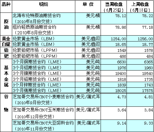 受投資者擔(dān)心颶風(fēng)季節(jié)來(lái)臨可能影響美國(guó)墨西哥灣石油生產(chǎn)的影響,25日紐約市場(chǎng)原油期貨價(jià)格全天漲幅超過(guò)3%,自5月初以來(lái)首次收于每桶78美元以上。同時(shí),國(guó)際油價(jià)還受到了利好經(jīng)濟(jì)數(shù)據(jù)的支撐。密歇根大學(xué)與路透社當(dāng)天公布的聯(lián)合報(bào)告顯示,6月份美國(guó)消費(fèi)者信心指數(shù)上升至兩年來(lái)的最高水平。此外,美元對(duì)歐元匯率當(dāng)天繼續(xù)走軟,也對(duì)以美元計(jì)價(jià)的大宗商品價(jià)格構(gòu)成支撐。 由于投資者在二十國(guó)集團(tuán)峰會(huì)召開(kāi)前保持謹(jǐn)慎以及美元匯率盤(pán)中下跌,紐約商品交易所25日黃金期貨8月合約收于1256.2美元,接近18日創(chuàng)下的每盎司1258.3美元的收盤(pán)價(jià)歷史高點(diǎn)。 美國(guó)商務(wù)部25日公布的數(shù)據(jù)顯示,今年第一季度美國(guó)國(guó)內(nèi)生產(chǎn)總值環(huán)比漲幅為2.7%,低于上月公布的修正值以及市場(chǎng)普遍預(yù)期的3.0%,加之一周以來(lái)接連公布的一系列不及預(yù)期的經(jīng)濟(jì)數(shù)據(jù),投資者對(duì)美國(guó)經(jīng)濟(jì)復(fù)蘇前景的憂慮進(jìn)一步加深。此外,擔(dān)保希臘國(guó)債違約成本25日早些時(shí)候觸及歷史新高,令投資者更加擔(dān)憂歐洲經(jīng)濟(jì)復(fù)蘇前景,以及財(cái)政緊縮政策將使深陷債務(wù)危機(jī)的歐元區(qū)國(guó)家面臨債務(wù)重組。投資者對(duì)二十國(guó)集團(tuán)峰會(huì)的謹(jǐn)慎觀望態(tài)度也推動(dòng)黃金和美國(guó)國(guó)債等避險(xiǎn)資產(chǎn)價(jià)格攀升。 芝加哥農(nóng)產(chǎn)品期貨價(jià)格當(dāng)周較前一周普遍下跌。受良好天氣因素打壓,芝加哥期貨交易所25日小麥期價(jià)創(chuàng)下3周以來(lái)的最大跌幅,玉米期價(jià)連續(xù)第五個(gè)交易日走低。大豆方面,由于美國(guó)農(nóng)民銷(xiāo)售大豆進(jìn)度緩慢,令舊作大豆供應(yīng)緊張,堅(jiān)挺的現(xiàn)貨市場(chǎng)以及美元匯率全面下跌抵消了理想天氣條件對(duì)大豆期價(jià)的打壓,令其價(jià)格與前一個(gè)交易日持平。