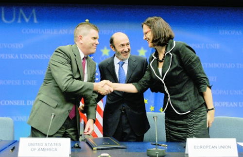6月28日,在比利時首都布魯塞爾的歐盟總部,歐盟輪值主席國西班牙內(nèi)政大臣魯瓦爾卡瓦(中)、歐盟委員會負(fù)責(zé)內(nèi)政事務(wù)的委員馬爾姆斯特倫(右)與美國駐歐盟使團臨時代辦多德曼簽署金融信息共享協(xié)議后握手祝賀。 當(dāng)天,歐盟與美國簽署了金融信息共享協(xié)議,為美國的“恐怖分子資金追蹤計劃”提供金融數(shù)據(jù)信息,加強雙方的反恐合作力度。