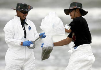 7月5日,工人在美國路易斯安那州的格蘭德艾爾海灘清理被漏油污染的沙子。