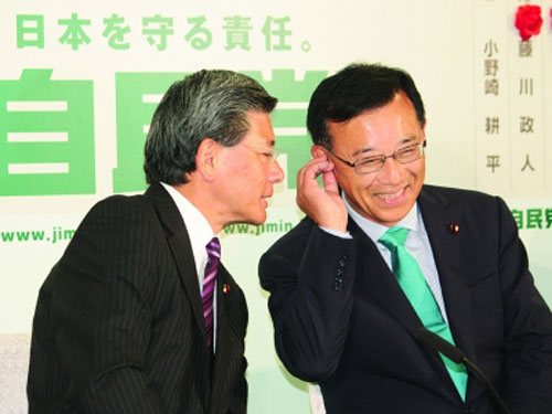 7月11日,在日本首都東京自民黨競選總部,自民黨總裁谷垣禎一(右)和總務(wù)會長田野瀨良太郎喜笑顏開。 據(jù)日本廣播協(xié)會電視臺報(bào)道,日本執(zhí)政的民主黨在11日舉行的國會參議院選舉中失利,自民黨等在野黨占據(jù)了參議院超過半數(shù)的議席!
