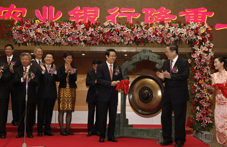 7月15日,中國(guó)農(nóng)業(yè)銀行A股在上海證券交易所掛牌上市,開(kāi)盤(pán)價(jià)2.74元/股。 這是中共中央政治局委員、上海市委書(shū)記俞正聲(右二)和中國(guó)農(nóng)業(yè)銀行董事長(zhǎng)項(xiàng)俊波(右三)共同為農(nóng)業(yè)銀行A股上市鳴鑼。