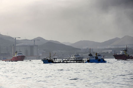 7月18日,遼寧海事局和大連有關(guān)部門把主要人力、物力投入到清除輸油管線爆炸造成的海洋污染上。截至18日15時,遼寧海事局等部門出動海事工作人員400人次,協(xié)調(diào)40多艘次船舶,車輛百余車次,在溢油海域布設圍油欄已擴大到9000多米,清除海洋污染的作業(yè)積極有效。清理過的海域,表面污染狀況有一定改善。