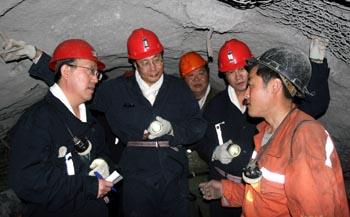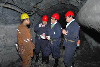 雞西分公司總經(jīng)理孫若山(左二)在井下考問工人安全生產(chǎn)知識。(資料照片) |