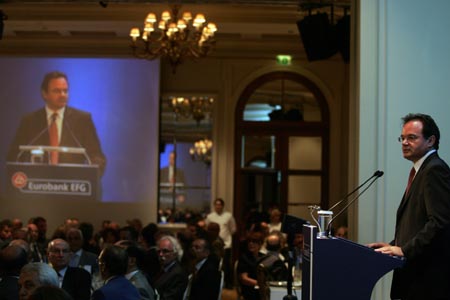 7月19日,希臘財長帕帕康斯坦季努在雅典出席希臘歐元銀行組織召開的研討會。 帕帕康斯坦季努當(dāng)天在研討會上表示,希臘銀行經(jīng)得起歐盟專家提出的考驗,希臘最終能戰(zhàn)勝危機(jī)。