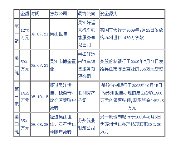 警方偵查發(fā)現(xiàn),“虛假購房”只是一系列事件的起點(diǎn)。 此案案情分為三個(gè)部分,其一是虛假增值稅發(fā)票向銀行貼現(xiàn)融資,其二是簽訂虛假購房合同騙取貸款,其三為非法放貸。這三項(xiàng)罪名之間互相關(guān)聯(lián),第三項(xiàng)非法放貸的資金中有近3600萬來源于第一、第二項(xiàng)獲得的信貸資金。 在信貸資金一再收緊之下,一條由信貸資金出發(fā),流經(jīng)開發(fā)商和中間人,轉(zhuǎn)入地下高利貸市場的路徑,由此浮出水面。 警方調(diào)查顯示,2009年,王某利用其控制的多家公司,虛構(gòu)貿(mào)易背景,在四家銀行辦理貼現(xiàn)3.12億元,共76筆。經(jīng)網(wǎng)上稅務(wù)信息系統(tǒng)核查,上述3.12億元銀票貼現(xiàn)業(yè)務(wù)中,查出不相符的增值稅發(fā)票288張,金額合計(jì)8294萬元,占比26.6%。 “由于網(wǎng)上稅務(wù)信息系統(tǒng)只能證明增值稅發(fā)票的真假,尚不能反映貿(mào)易背景真實(shí)性的全部信息,我們將進(jìn)一步到稅務(wù)機(jī)關(guān)逐筆核對!毕嚓P(guān)銀行稱。目前稅務(wù)機(jī)關(guān)正在協(xié)助警方核對這部分信息。 同樣是在2009年,王某又安排了包括唐駿在內(nèi)的8名親友與博金置業(yè)簽訂了購房合同,并以此向某股份制商業(yè)銀行吳江支行辦理按揭貸款,總額1.47億元。 隨后,王某以其控制的“吳江世佳”、“蘇州世佳”等公司或公司員工的名義,向蘇州優(yōu)曼服裝有限公司等9家企業(yè),非法放貸1.03億元。其中,博金置業(yè)將某股份制商業(yè)銀行吳江支行發(fā)放的565萬元貸款中的500萬元,轉(zhuǎn)手便貸給了吳江好運(yùn)來汽車銷售服務(wù)有限公司。 相關(guān)銀行核查顯示,在總共列出的四筆高利貸中,資金來自于銀行貸款和票據(jù)承兌的總額近3600萬元。(如下表)