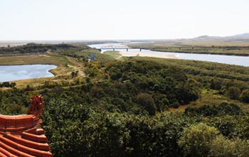 吉林省琿春市防川三國接壤的獨(dú)特景觀:左上方為俄羅斯,右上方為朝鮮,下方為中國,右方水域為圖們江。新華社記者 徐家軍 攝 |