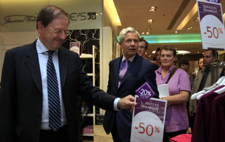 8月3日,法國(guó)負(fù)責(zé)貿(mào)易和旅游事務(wù)的國(guó)務(wù)秘書埃爾韋·諾韋利(左)在法國(guó)巴黎的老佛爺百貨商店參觀。 經(jīng)過長(zhǎng)達(dá)5個(gè)星期的“熱鬧”,法國(guó)大部分地區(qū)2010年夏季打折季于3日落下帷幕。埃爾韋·諾韋利預(yù)測(cè)說,今夏打折季的營(yíng)業(yè)額將至少同比增長(zhǎng)5%,而一些行業(yè)協(xié)會(huì)對(duì)此表現(xiàn)出謹(jǐn)慎態(tài)度。
