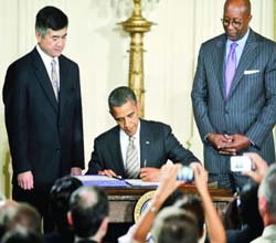 8月11日,美國總統(tǒng)奧巴馬(中)在首都華盛頓白宮簽署制造業(yè)促進法案。奧巴馬當天簽署了制造業(yè)促進法案,旨在幫助制造業(yè)降低成本,恢復競爭力,創(chuàng)造更多就業(yè)崗位。
