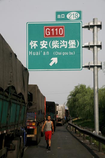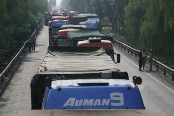 走這條路的大部分是從內(nèi)蒙古和山西來的拉煤的大貨車,而據(jù)記者了解這些車輛超載現(xiàn)象比較嚴重,司機反映貨運價格太低,再加上一路上的過路費,如果不超載就沒有利潤。而一路上每個地區(qū)都有治理超載的站點,每到一個站點都要進行稱重、卸載,面對如此大數(shù)量的大貨車,必然造成了擁堵。