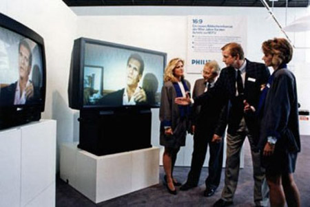 飛利浦在1989年IFA上展出了一款16:9寬屏電視機(jī)。飛利浦當(dāng)時(shí)稱這種電視“為90年代的觀眾提供一種全新的圖片格式”。寬屏電視機(jī)系統(tǒng)最初被用于歐洲的衛(wèi)星電視廣播,隨后一些模擬電視廣播也采用了該技術(shù)。不過,直到數(shù)字電視廣播成為主流之后,這一格式才得到廣泛應(yīng)用。