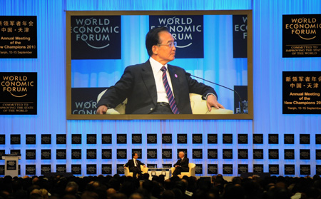 9月13日,世界經(jīng)濟(jì)論壇2010年新領(lǐng)軍者年會(huì)(簡(jiǎn)稱“夏季達(dá)沃斯論壇”)在天津開幕。中國(guó)國(guó)務(wù)院總理溫家寶出席開幕式并致辭。這是溫家寶和世界經(jīng)濟(jì)論壇主席施瓦布在開幕式上。