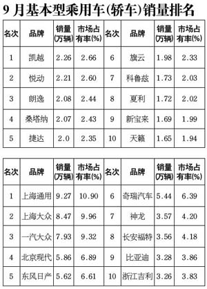 9月,從前十名轎車企業(yè)銷量排名情況來看,與上月比較,上海大眾、北京現(xiàn)代、長安福特和吉利排名保持不變;排名上升的有:上海通用、東風日產(chǎn);排名下降的有:一汽大眾、比亞迪、奇瑞;一汽豐田跌出前十,神龍新進前十。