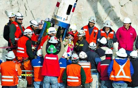 10月13日,在智利圣何塞銅礦,第10名獲救礦工亞歷克斯·維加(中間戴墨鏡者)順利抵達(dá)地面后慶祝。經(jīng)過10余個(gè)小時(shí)的緊張工作,被困于地下700米深處達(dá)69天的33名礦工已有15名成功升井。