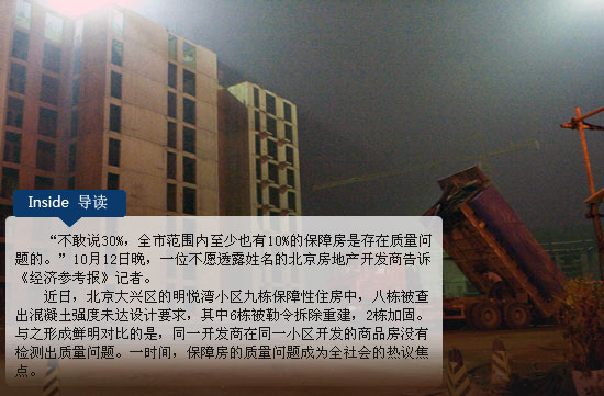 “不敢說30%,全市范圍內(nèi)至少也有10%的保障房是存在質(zhì)量問題的!10月12日晚,一位不愿透露姓名的北京房地產(chǎn)開發(fā)商告訴《經(jīng)濟參考報》記者。