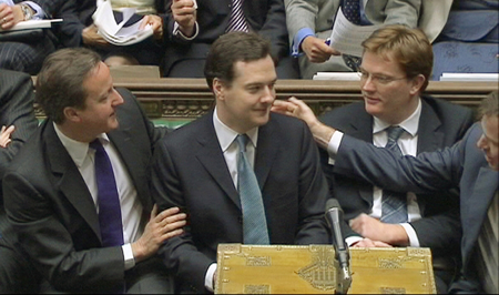 圖為英國財政大臣喬治·奧斯本(左二)20日在議會公布政府削減財政預(yù)算方案之后的情形,左一為英國首相戴維·卡梅倫。根據(jù)該方案,英國政府將在未來幾年削減830億英鎊的財政預(yù)算,其中社會福利開支將減少70億英鎊,英國人的退休年齡到2020年也將升至66歲。英國官方數(shù)據(jù)顯示,政府上一財年的財政赤字為1454億英鎊,創(chuàng)二戰(zhàn)以來的最高紀(jì)錄。