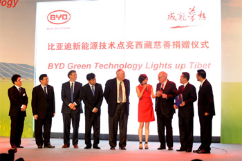 比亞迪向西藏免費提供千套自主研發(fā)的總價值為2500萬元的家庭能源系統(tǒng)簽約儀式日前在北京舉行。比亞迪總裁王傳福、巴菲特、伯克夏·哈撒韋公司副主席查理·芒格、微軟前董事長比爾·蓋茨等共同見證了這一科技善舉。