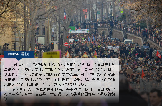 法國最近一次第六輪跨行業(yè)大罷工發(fā)生在本月19日,法國工會和反對黨再次舉行大規(guī)模游行示威活動(dòng),反對退休制度改革。全法300多萬人走上街頭,包括不少年輕的身影。地鐵、鐵路和機(jī)場罷工使得當(dāng)天公共交通幾近癱瘓。在巴黎,一位示威者對《經(jīng)濟(jì)參考報(bào)》記者說:“法國失業(yè)率居高不下,政府卻要年紀(jì)大的人延遲退休年齡,更多年輕人會找不到工作!边@代表很多游行學(xué)生的想法。另一位叫德邁的示威者則說:“政府的改革方案讓我們感覺不公平。政府有其它的辦法來削減赤字,比如說,可以讓富人承擔(dān)更多義務(wù)!
