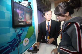 手機支付已成為新的競爭熱點,圖為在10月份舉辦的中國國際通信展上某工作人員向觀眾展示其手機支付業(yè)務(wù)。新華社記者 陳曉根/攝 |