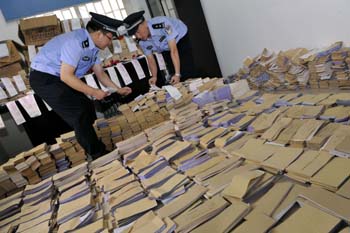 假發(fā)票在全國(guó)屢禁不止。圖為今年8月,鄭州警方成功打掉一個(gè)涉嫌制售假發(fā)票的犯罪團(tuán)伙,搗毀假發(fā)票制售存儲(chǔ)窩點(diǎn)7個(gè),收繳假發(fā)票32萬余份(包括3萬多份增值稅假發(fā)票),假發(fā)票可開具的票面金額高達(dá)150多億元。新華社發(fā)(劉書亭/攝) |