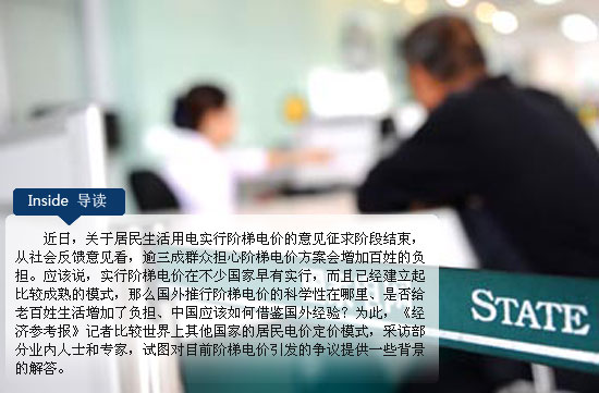 編者按:近日,關(guān)于居民生活用電實行階梯電價的意見征求階段結(jié)束,從社會反饋意見看,逾三成群眾擔(dān)心階梯電價方案會增加百姓的負(fù)擔(dān)。應(yīng)該說,實行階梯電價在不少國家早有實行,而且已經(jīng)建立起比較成熟的模式,那么國外推行階梯電價的科學(xué)性在哪里、是否給老百姓生活增加了負(fù)擔(dān)、中國應(yīng)該如何借鑒國外經(jīng)驗?為此,《經(jīng)濟參考報》記者比較世界上其他國家的居民電價定價模式,采訪部分業(yè)內(nèi)人士和專家,試圖對目前階梯電價引發(fā)的爭議提供一些背景的解答。