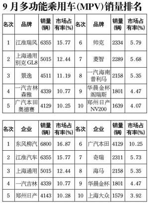 與上月相比,9月銷(xiāo)量排名前十位品牌中,森雅、奧德賽、普利馬分別由上月的三、四、五位下降為四、五、八位;景逸、帥克、菱智新進(jìn)入前十,風(fēng)行、開(kāi)瑞優(yōu)雅、福建戴姆勒跌出前十;瑞風(fēng)、別克GL8仍然保持前兩位,閣瑞斯、NV200繼續(xù)保持末兩位。