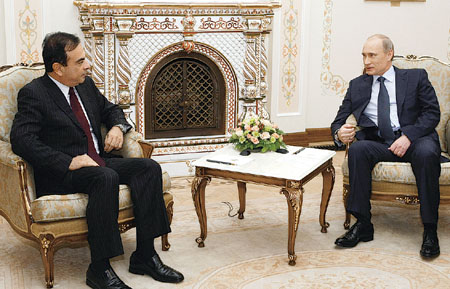 俄羅斯總理普京(右)2日在莫斯科會見雷諾-日產(chǎn)公司CEO卡洛斯·戈恩(左)時表示,雷諾-日產(chǎn)可以有機會收購俄最大汽車生產(chǎn)商伏爾加汽車公司的控制股。