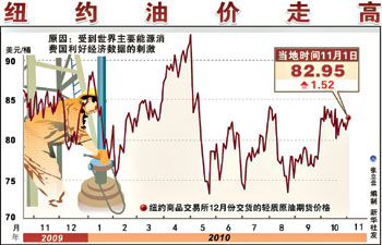 由于中國(guó)和美國(guó)經(jīng)濟(jì)數(shù)據(jù)利好等因素的影響,國(guó)際油價(jià)1日全面走高。紐約商品交易所12月交貨的輕質(zhì)原油期貨價(jià)格比前一個(gè)交易日上漲1.52美元,收于每桶82.95美元;倫敦市場(chǎng)北海布倫特原油期貨價(jià)格上漲1.47美元,收于每桶84.62美元。
