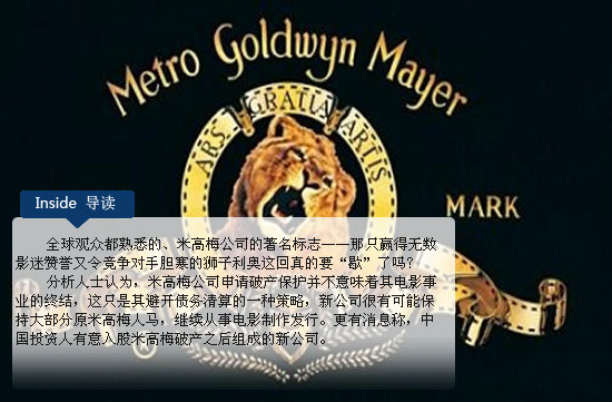 由于無(wú)法償付高達(dá)40億美元的巨額債務(wù),曾是全球最大電影公司的米高梅11月3日宣布申請(qǐng)破產(chǎn)保護(hù),其申請(qǐng)也隨即獲得法院的批準(zhǔn)。全球觀眾都熟悉的、米高梅公司的著名標(biāo)志——那只贏得無(wú)數(shù)影迷贊譽(yù)又令競(jìng)爭(zhēng)對(duì)手膽寒的獅子利奧這回真的要“歇”了嗎?
