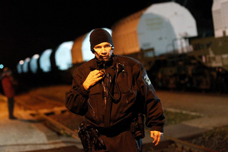 11月8日,在德國(guó)丹嫩貝格,一名防暴警察在運(yùn)載核廢料的列車旁工作。 運(yùn)載核廢料的列車當(dāng)日抵達(dá)終點(diǎn)站德國(guó)丹嫩貝格。列車從法國(guó)出發(fā)以來(lái),反核抗議者在沿途鐵路用各種手段阻止列車行進(jìn)。數(shù)千名抗議者7日與警方?jīng)_突升級(jí),雙方陷入“混戰(zhàn)”。
